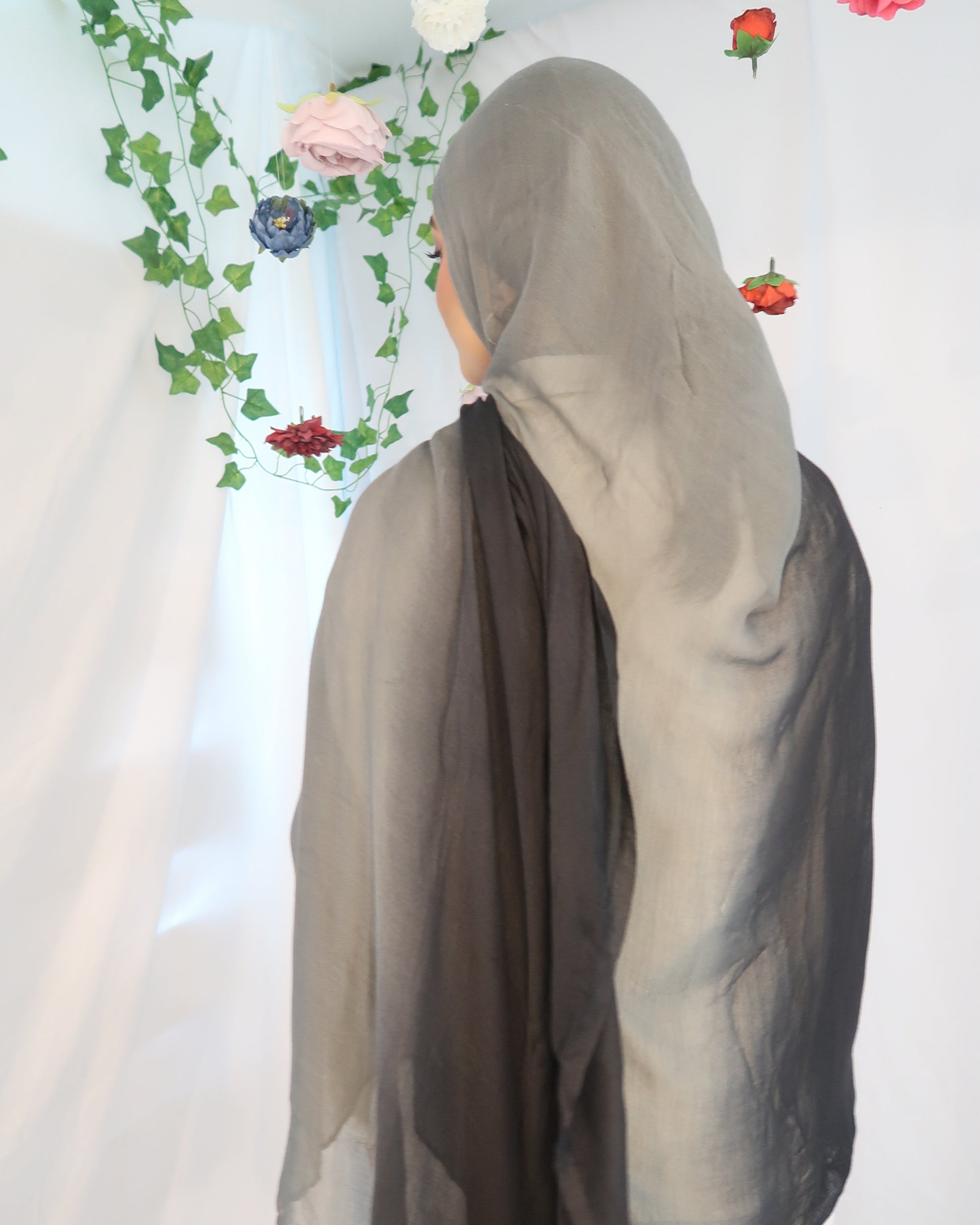 Steam or iron on low heat while slightly damp. Always place a thin cloth between the iron and the hijab. Store folded or loosely rolled in a drawer — avoid hanging long-term as it can stretch the weave.
