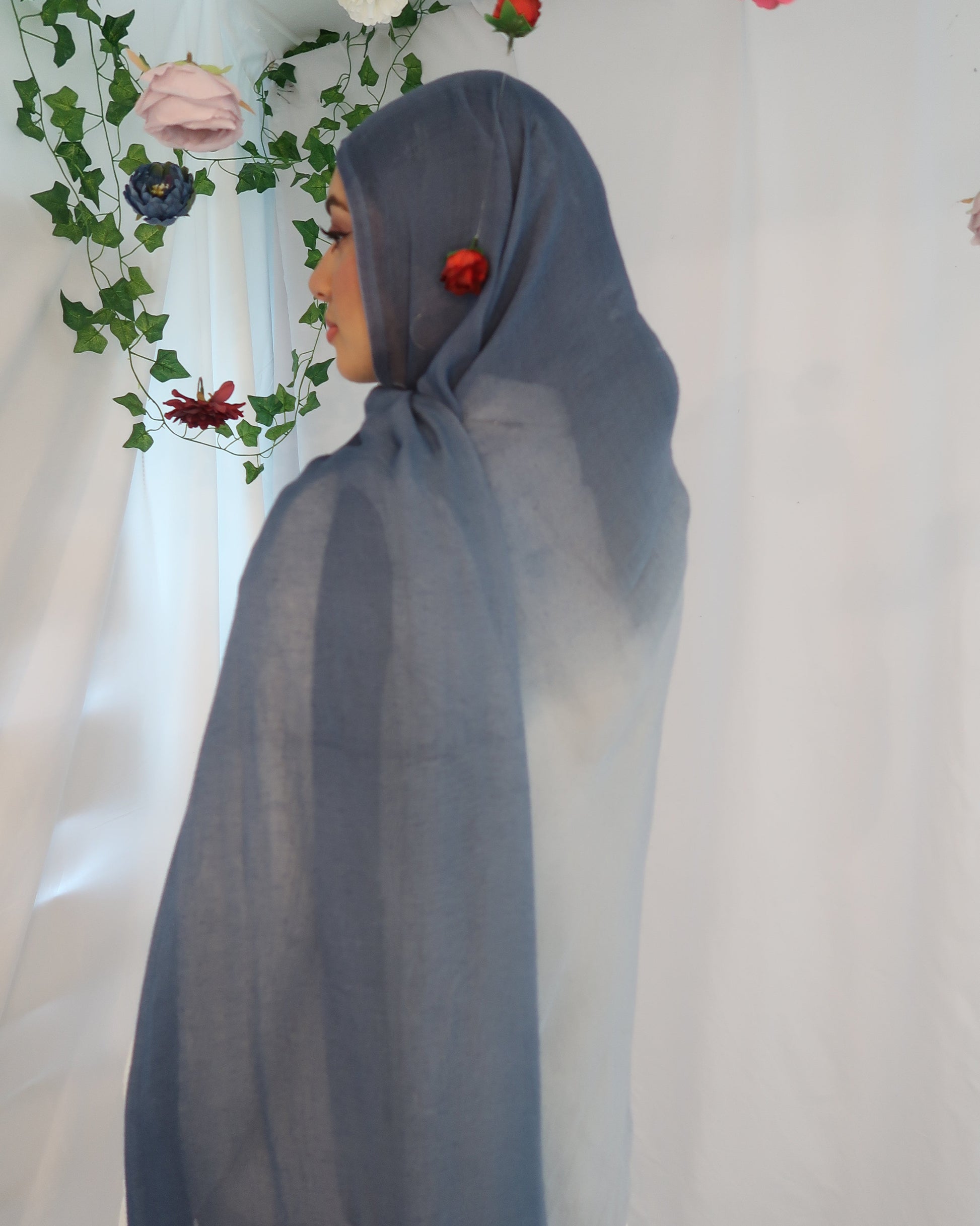 Steam or iron on low heat while slightly damp. Always place a thin cloth between the iron and the hijab. Store folded or loosely rolled in a drawer — avoid hanging long-term as it can stretch the weave.