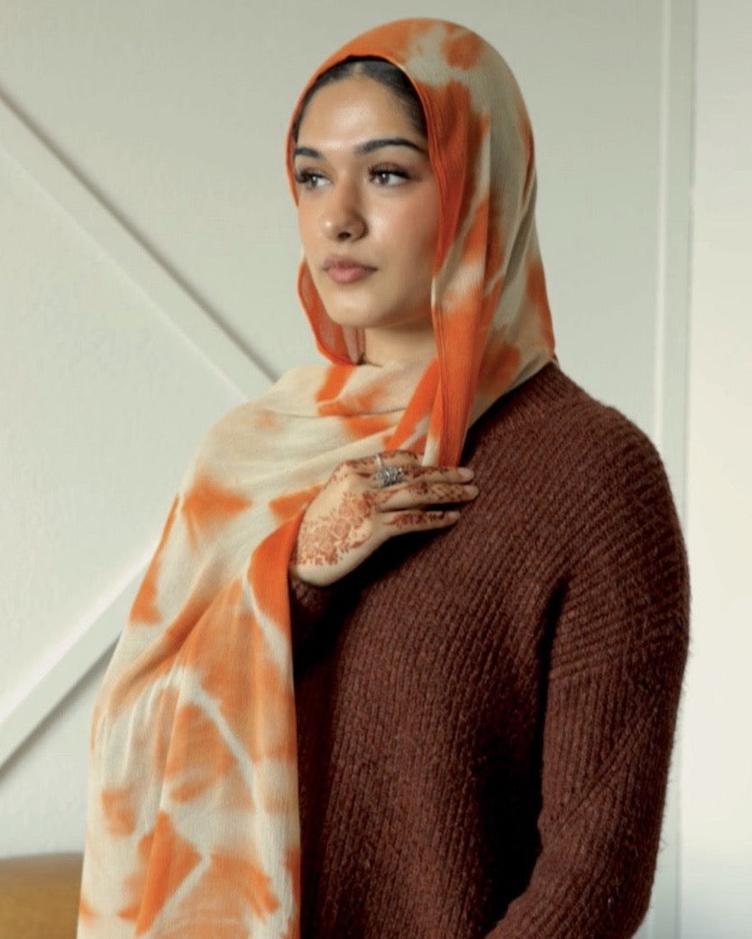 Steam or iron on low heat while slightly damp. Always place a thin cloth between the iron and the hijab. Store folded or loosely rolled in a drawer — avoid hanging long-term as it can stretch the weave.