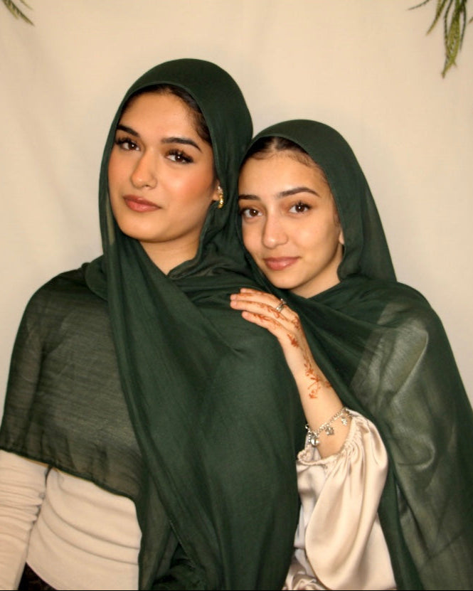 Steam or iron on low heat while slightly damp. Always place a thin cloth between the iron and the hijab. Store folded or loosely rolled in a drawer — avoid hanging long-term as it can stretch the weave.