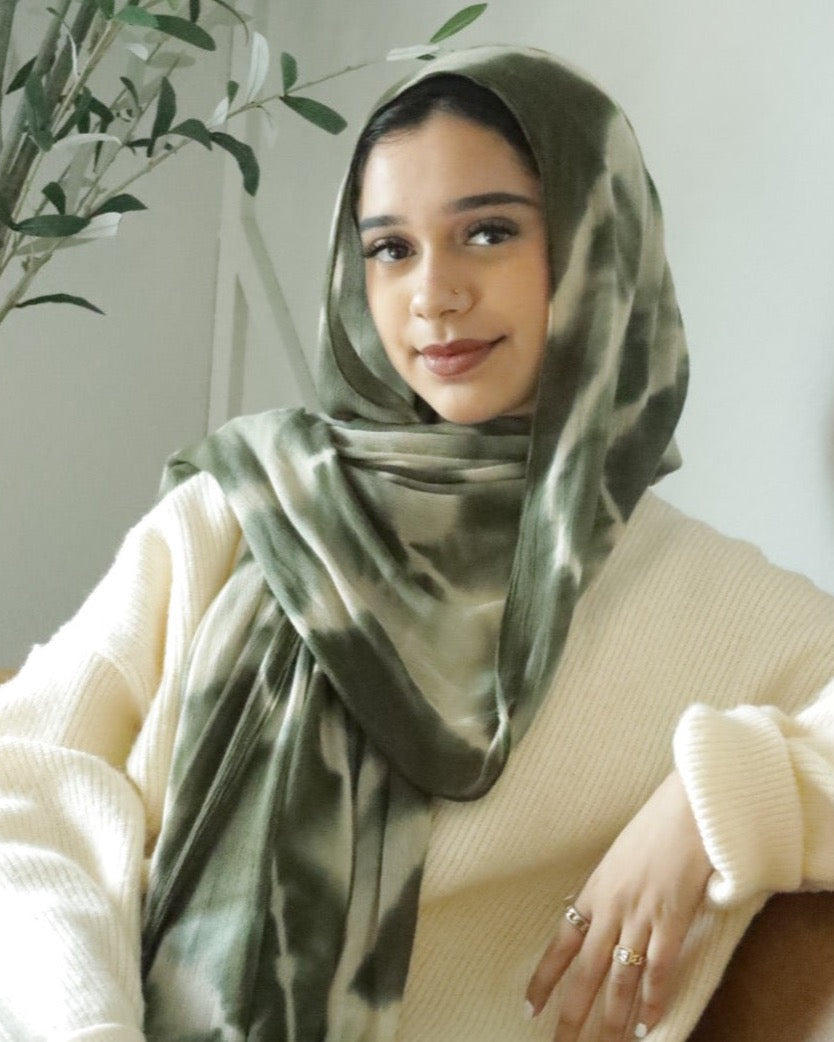 Steam or iron on low heat while slightly damp. Always place a thin cloth between the iron and the hijab. Store folded or loosely rolled in a drawer — avoid hanging long-term as it can stretch the weave.