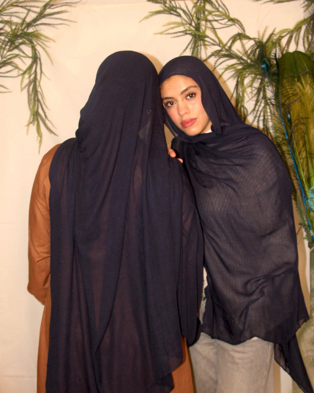 Steam or iron on low heat while slightly damp. Always place a thin cloth between the iron and the hijab. Store folded or loosely rolled in a drawer — avoid hanging long-term as it can stretch the weave.