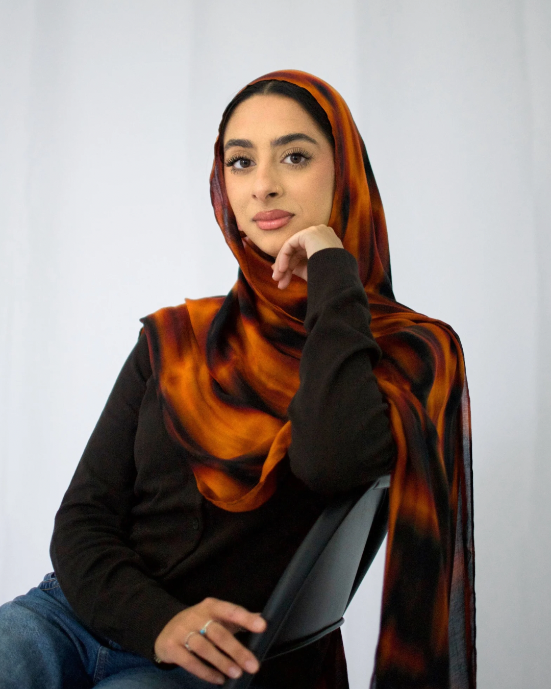 Steam or iron on low heat while slightly damp. Always place a thin cloth between the iron and the hijab. Store folded or loosely rolled in a drawer — avoid hanging long-term as it can stretch the weave.