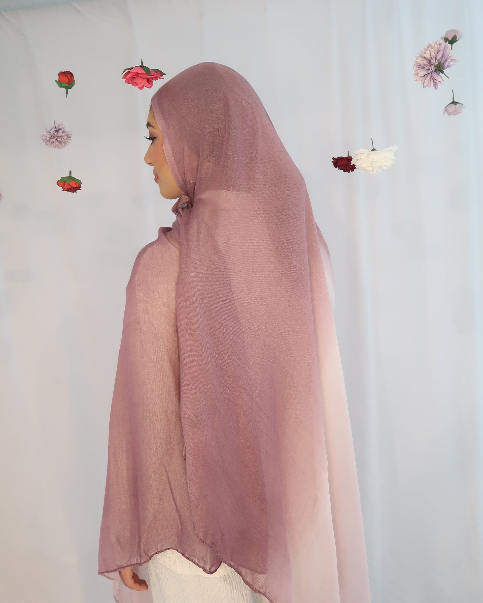 Steam or iron on low heat while slightly damp. Always place a thin cloth between the iron and the hijab. Store folded or loosely rolled in a drawer — avoid hanging long-term as it can stretch the weave.