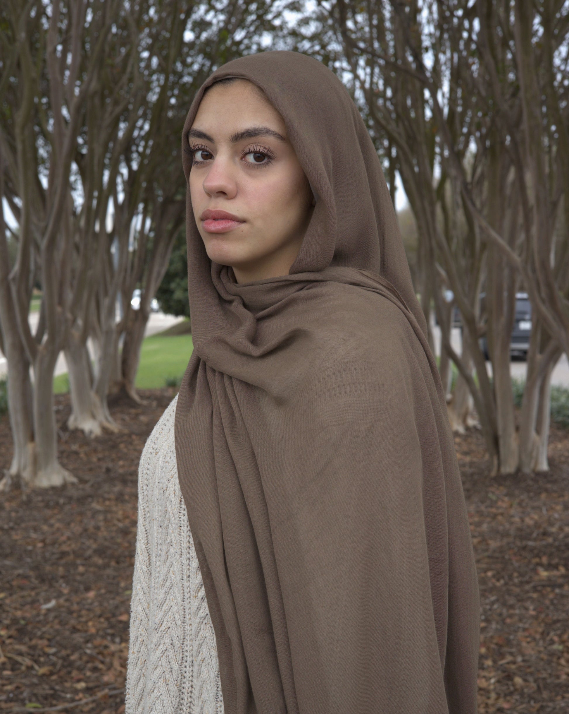 Steam or iron on low heat while slightly damp. Always place a thin cloth between the iron and the hijab. Store folded or loosely rolled in a drawer — avoid hanging long-term as it can stretch the weave.